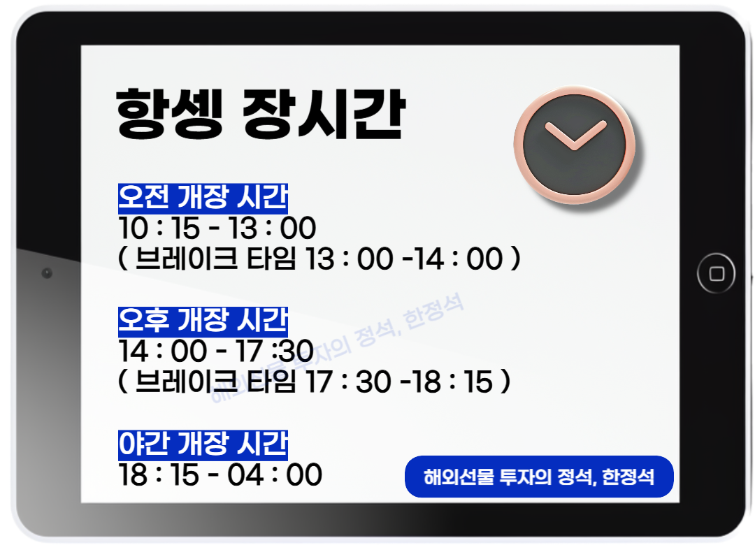해외선물 시장은 하루 종일 열려 있는 것이 아니라, 세 번의 장시간으로 나뉘어 운영됩니다. 각 장시간 사이에는 쉬는 시간(브레이크 타임)이 있으니, 거래 전에 시간을 꼭 확인하세요!