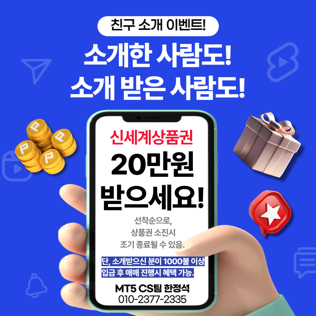 친구가 EZ스퀘어 계좌 만들고 1,000달러 이상 입금해서 거래까지 하면, 친구도 나도 20만원 상품권 받을 수 있어요! 추가 입금 이벤트도 있으니, 궁금한 분은 바로 카톡 주세요!